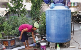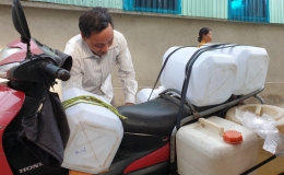 Nắng nóng kéo dài, nguồn nước bị nhiễm mặn không thể sử dụng vào việc ăn uống, người dân phải vất vả đi xin các hộ dân trong vùng.