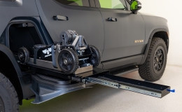 Mẫu bán tải điện Rivian R1T có kiểu hộc chứa đồ giữa thân xe và thông cả hai bên, để được nhiều dạng đồ đạc khác nhau.