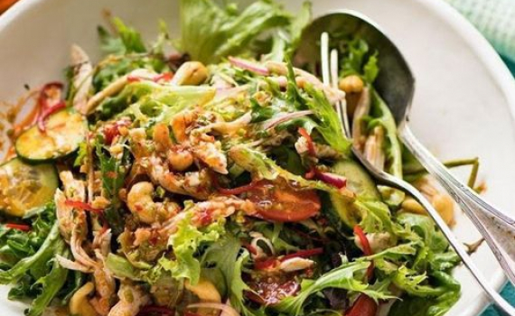 Rau củ cùng thịt ức gà trộn với hỗn hợp nước mắm chua cay giúp người nội trợ có được đĩa salad ngon, hấp dẫn.