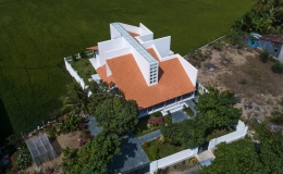 Căn biệt thự có quy mô ba tầng, diện tích một mặt sàn khoảng 100m2, nằm tại Bình Chánh (TP HCM). Tầng một gồm không gian phòng khách và phòng bếp. Tầng hai gồm thư viện và phòng ngủ chính. Tầng mái bố...