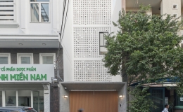 Mặt tiền sử dụng hoàn toàn gạch bông gió giúp căn nhà như được phủ bởi một hệ thống rèm ngăn cản nắng nóng hướng Tây.