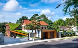 Công trình lấy cảm hứng từ kiến trúc nhà rông Tây Nguyên và trường Cao đẳng Sư phạm Đà Lạt, gợi gia chủ nhớ về thời thơ ấu.