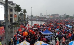 Hàng nghìn người hâm mộ Thái Bình đội mưa cổ vũ cho đội tuyển U23 Việt Nam tại quảng trường 14/10