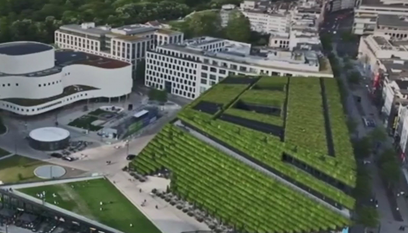 Tòa nhà Ko-Bogen II (Đức) trồng hơn 30.000 cây non ở mặt ngoài, giúp làm mát, giảm tiếng ồn và cải thiện chất lượng không khí.
