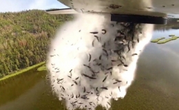 Máy bay thả hàng triệu con cá xuống mặt hồ