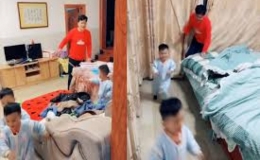 Đến giờ ngủ nhưng 3 anh em vẫn không chịu nằm yên trên giường khiến bố phải cầm roi chạy đuổi theo sau.