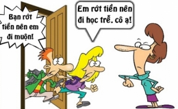 Đang trong giờ học, cô giáo đang giảng bài thì có hai em học sinh đến trễ khúm núm bước vào. Cô giáo thấy vậy liền hỏi: