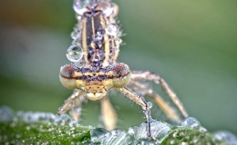 Sương sớm khiến những con chuồn chuồn bỗng trở nên tuyệt đẹp với đôi cánh như được đính kim cương lóng lánh.