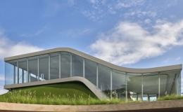 Nhìn từ trên cao, ngôi nhà với mái dốc phủ đầy cỏ, cây và hoa, giống như một ngọn đồi trải dài ra bờ sông phía trước.