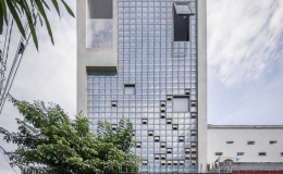 Mặt tiền hoàn toàn bằng gạch kính và gạch bông gió, phản xạ ánh nắng hướng Tây, tạo ra sự chênh lệch áp suất để không khí trong nhà liên tục luân chuyển...