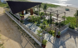 Công trình nghỉ dưỡng thiết kế đơn giản nhưng độc đáo, tạo cảm giác gần gũi, thân quen với hình ảnh mái đỏ, sân cát.