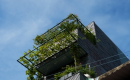 Mặt tiền nhà với ý tưởng từ vách đá của thác Pongou, Đà Lạt, bị cắt xẻ bởi hiện tượng phong hóa cùng cây cối cắm rễ sâu vào từng kẽ đá.