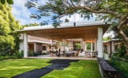 Sử dụng vật liệu và hình thái kiến trúc đậm chất truyền thống, công trình không chỉ đáp ứng nhu cầu tụ họp của gia chủ mà còn phù hợp với khí hậu nhiệt đới.
