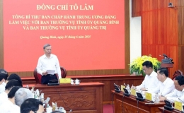 Sáng 25/6, tại Quảng Bình, Tổng Bí thư Tô Lâm và Đoàn công tác của Trung ương làm việc với Ban Thường vụ Tỉnh ủy Quảng Bình và Ban Thường vụ Tỉnh ủy Quảng...