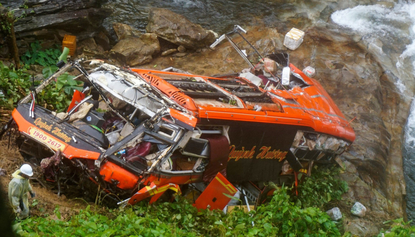 Xe giường nằm 45 chỗ tông vỡ taluy bêtông cốt thép trên cao tốc La Sơn - Túy Loan, lộn 3-4 vòng xuống vực sâu 30 m và nằm cách thác nước chỉ vài 20 m.