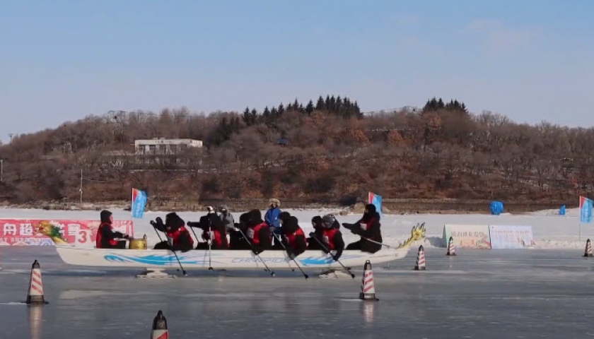 Mái chèo và thuyền rồng được cải tiến phù hợp di chuyển trên mặt băng để các tay đua tranh tài tại miền bắc Trung Quốc.