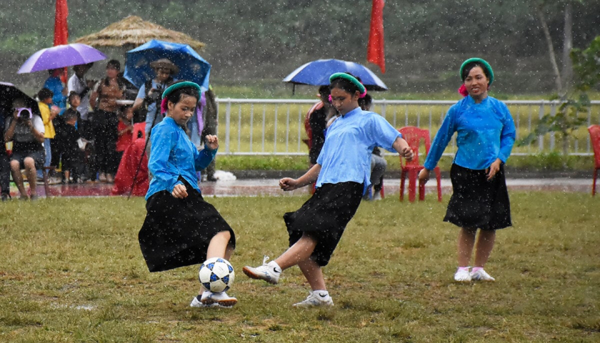 Ra sân với trang phục dân tộc, mặc váy, đầu vấn khăn..., những phụ nữ dân tộc Sán Chỉ ở Quảng Ninh cống hiến cho du khách trận cầu nảy lửa giữa trời mưa...