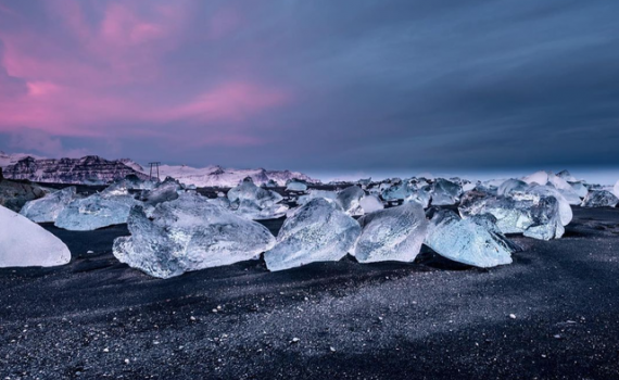 Một bãi biển cát đen rải rác các tảng băng lớn lấp lánh như những viên kim cương đã trở thành một trong những điểm thu hút du khách nhất ở Iceland.