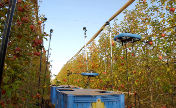 Công ty Israel phát triển robot gồm 6 drone nối với một phương tiện tự động dưới mặt đất, có thể bay cao 5 m để hái quả.
