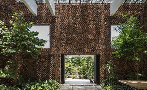 Việc sắp xếp những viên gạch nghiêng, cùng màu sắc của gạch giống với tổ ong tạo nên vẻ ngoài độc đáo cho ngôi nhà.