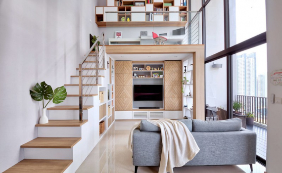Một căn hộ áp mái tọa lạc tại Singapore được bố trí phần gác lửng để có thêm không gian cho việc sinh hoạt và nghỉ ngơi.
