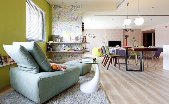 Căn hộ màu sắc được trang trí bằng giấy dán tường