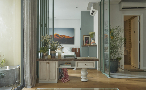 Ngoài toilet, cả căn hộ 46m2 không có vách ngăn nào, giúp các không gian như hòa vào một, trong veo, xanh mát.