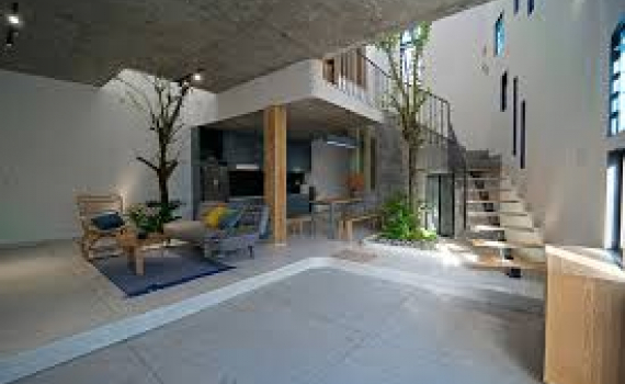 Nhờ cách bố trí hợp lý, mọi căn phòng trong căn nhà méo đều có ánh sáng tự nhiên và tiếp xúc với cây xanh.