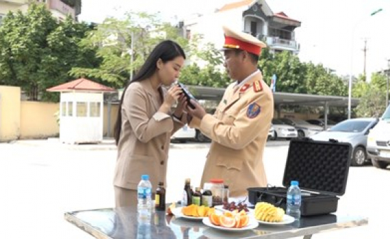 Cảnh sát giao thông tổ chức thực nghiệm cho nhân vật ăn bốn loại quả khác nhau, uống bổ phế và nước si rô rồi kiểm tra nồng độ cồn.