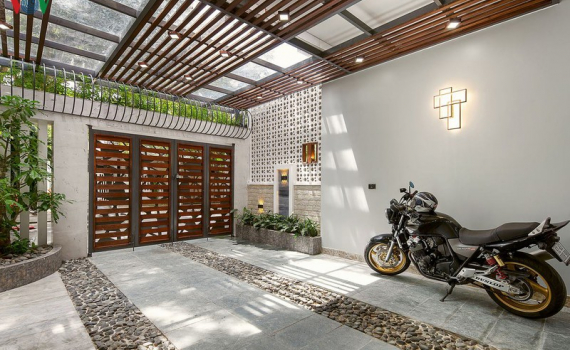 Công trình mang vẻ hiện đại, sang trọng từ sự kết hợp giữa hai loại vật liệu là đá và gỗ, lại vừa cực kỳ ấn tượng với giếng trời tràn ngập cây xanh.