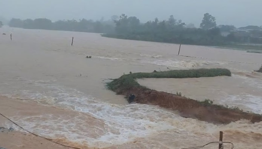 Một đoạn thành đập Dạ Lam (huyện Lệ Thủy, tỉnh Quảng Bình) dài khoảng 15m bị vỡ, nước đang tràn về các xã phía hạ du.