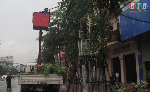 Sáng ngày 17/7, Công ty Cổ phần Môi trường và Công trình đô thị Thái Bình huy động hơn 100 công nhân tiến hành cắt, tỉa cành, hạ thấp tán cây xanh phòng...