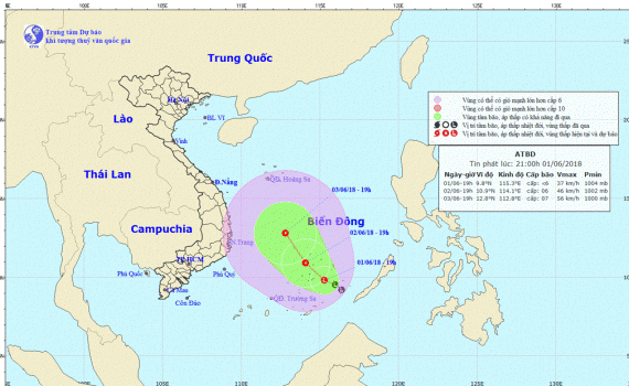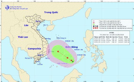 Hồi 19 giờ ngày 01/06, vị trí trung tâm vùng áp thấp ở vào khoảng 9,3-10,3 độ Vĩ Bắc; 114,8-115,8 độ Kinh Đông.