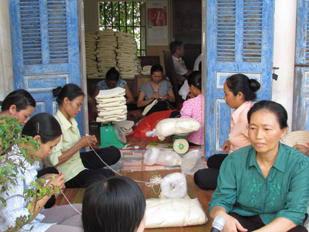 Chị Bùi Thị Hiến ở thôn Nam Hòa, xã Hồng Tiến (Kiến Xương) là chủ cơ sở làm nghề thủ công móc túi sợi xuất khẩu.