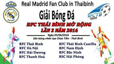 Cuối tuần này (5/6), kỷ niệm 1 năm thành lập, Hội CĐV Real Madrid tại Thái Bình sẽ tổ chức giải bóng đá RFCTB mở rộng lần 2 năm 2016. Đây là giải đấu có...