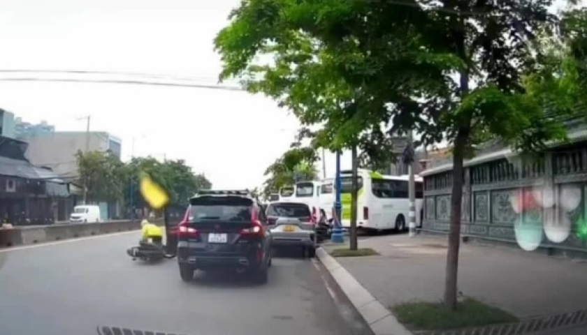 TP HCM - Xe ôtô dừng quá xa lề, tài xế mở cửa không quan sát khiến cửa đập vào người đi xe máy.