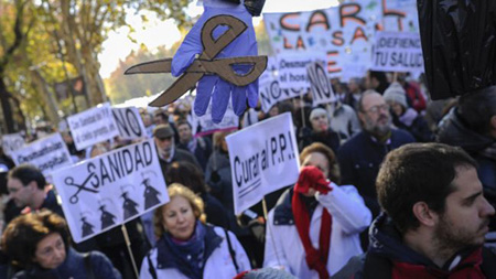 Hôm 13/11, tại thủ đô Madrid của Tây Ban Nha diễn ra nhiều cuộc biểu tình với sự tham gia của hàng nghìn nhân viên làm việc trong lĩnh vực y tế công...