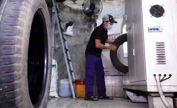 Kỹ thuật viên dùng máy li tâm tráng lớp keo bằng cao su non dày 5 mm vào mặt trong để ngăn thủng lốp ôtô khi dính đinh, chi phí khoảng 1,5 triệu đồng mỗi...