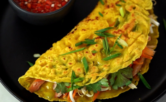 Sự kết hợp giữa gà xé sợi, các loại rau cùng nước mắm chấm mang lại cho bạn miếng bánh xèo giòn rụm, hấp dẫn.