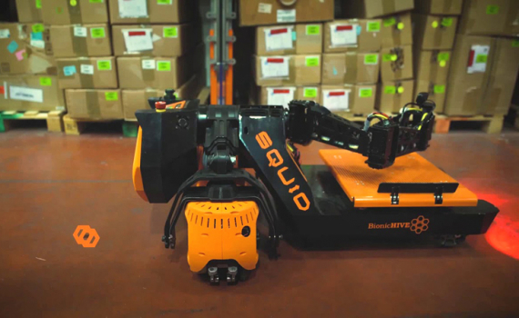Robot SqUID hoạt động trong nhà kho, có thể leo lên leo xuống các kệ hàng và tránh chướng ngại vật.