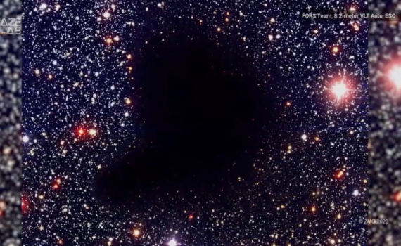 Barnard 68, đám mây vũ trụ có khối lượng gấp đôi Mặt Trời, hấp thụ hầu hết ánh sáng khả kiến của những ngôi sao phía sau.