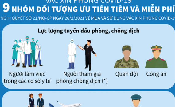Nghị quyết số 21/NQ-CP ngày 26/2/2021 về mua và sử dụng vaccine phòng Covid-19 nêu rõ 9 nhóm đối tượng ưu tiên tiêm và miễn phí vaccine Covid-19.