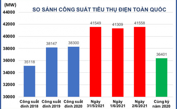 Theo số liệu từ Trung tâm Điều độ Hệ thống điện Quốc gia, công suất tiêu thụ điện toàn quốc ngày 2/6/2021 lại tiếp tục lập đỉnh mới là 41558 MW.