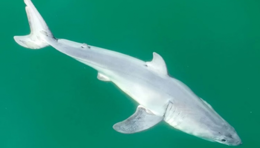Con cá mập trắng non dài 1,5 m được drone ghi hình ngoài khơi California (Mỹ) với chất lạ màu trắng sữa bao phủ toàn thân.