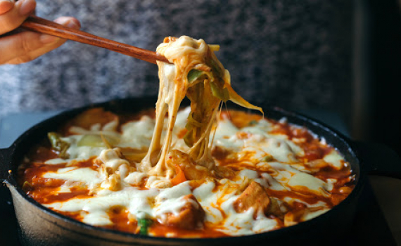 Thịt gà được tẩm ướp với tương và bột ớt Hàn sau đó kết hợp cùng phô mai sợi mang lại cho người nội trợ món ăn thơm cay ngày se lạnh.