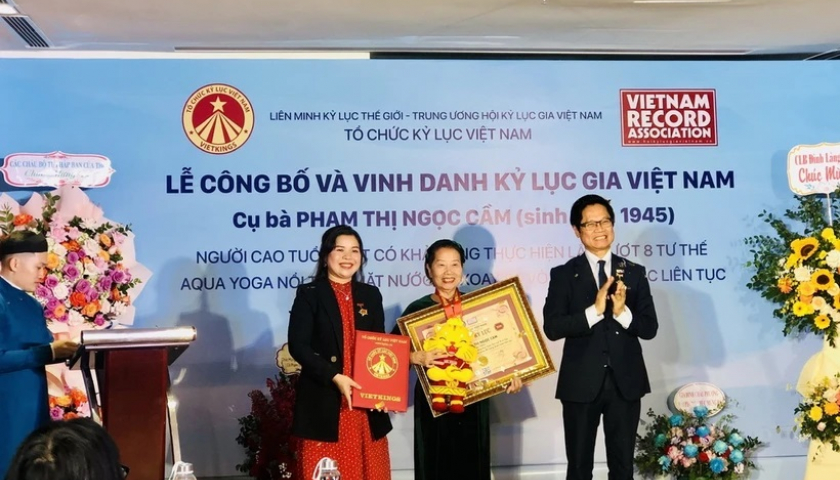 Bà Phạm Thị Ngọc Cầm, 78 tuổi, ở Long Biên, Hà Nội, lập Kỷ lục Việt Nam với nội dung: Người cao tuổi nhất có khả năng thực hiện 8 tư thế Aqua Yoga nổi...