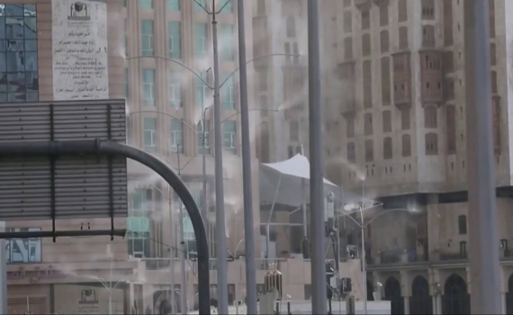 Thành phố Mecca (Ả Rập Xê-út) lắp đặt các cột và quạt phun sương treo trên cao, giúp làm ẩm và hạ nhiệt độ không khí cho những người hành hương.