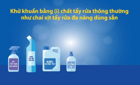 Sử dụng chai tẩy rửa đa năng, nước tẩy bồn cầu, nước chứa 0,05% clo, cồn 70 độ, pha nước để khử khuẩn tại nhà ở, chung cư, công sở, theo hướng dẫn của Bộ...