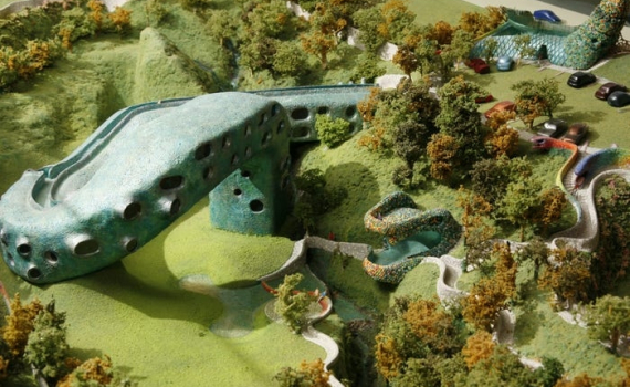 Tổ hợp 10 căn hộ với hình dáng như một con rắn khổng lồ, được bao quanh bởi rừng cây.