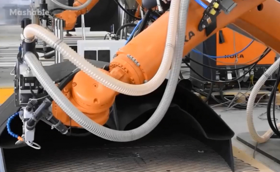 Thân thuyền buồm Beluga được in liền một mảnh bằng những cánh tay robot 6 trục với "mực in" là vật liệu tái chế.